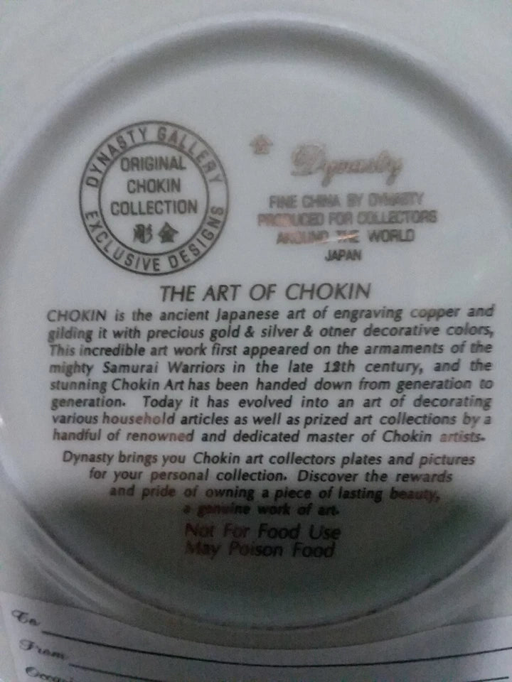 This exquisite collector plate celebrates the 50th anniversary of the Chokin Dynasty in Japan. The intricate engraving on the white porcelain plate is a stunning piece of art that showcases the rich culture of Japanese decor. The gold trim adds a touch of elegance to this unique piece, making it a valuable addition to any collection.