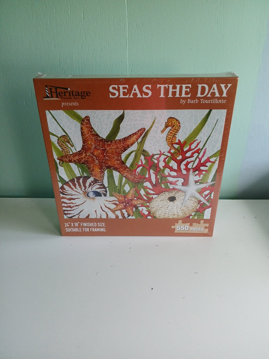 The Heritage Puzzle Inc. SEAS THE DAY 550 Pieces puzzle is a colorful and engaging jigsaw puzzle featuring an ocean theme, perfect for those who love sea creatures and the beauty of the underwater world. With interlocking pieces made of sturdy cardboard, this puzzle is ideal for individuals aged 8 years and up. The puzzle comes sealed in a box, ensuring that all pieces are present and ready to be assembled for a complete and satisfying experience. Made in the United States by the trusted brand Heritage Puzzle, this puzzle is a great addition to any puzzle enthusiast's collection.